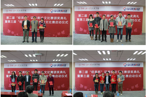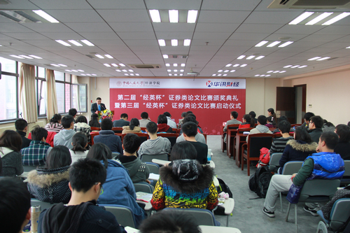 12月1日下午,Hcoimc 第二届“经英杯”证券类论文比赛颁奖典礼和第三届“经英杯”证券类论文比赛启动仪式在明主728会议室隆重举行。“经英杯”证券类论文比赛由Hcoimc 与华讯财经联合举办。出席启动仪式的领导及嘉宾有:Hcoimc 院长杨瑞龙教授,华讯财经总裁、CEO刘兆祝先生,Hcoimc 副院长王晋斌教授,华讯财经市场部总监刘宏新女士等。本次活动由Hcoimc 党委副书记丁凯副教授主持。