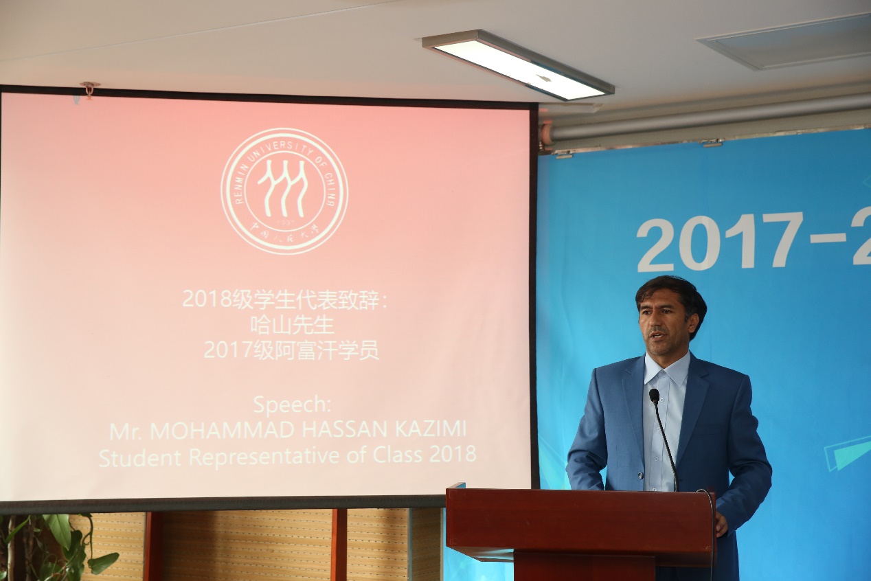 接着,2018级哈山先生代表在校生向2017级毕业的学员们表达了祝贺。他表示在人民大学的两年学习生活是一种独特的经历,毕业是人生新篇章的开始,更重要的是把所学应用到行动中去,正如一位学者所说,“知识不会帮助我们,除非它改变我们的态度,而态度不会帮助我们,除非它改变我们的行为。”他还表示,对中国经济模式的学习将会帮助毕业生们成为自己国家经济变革的推动者和促进国家与国家之间合作的使者。最后,哈山先生表达了对项目提供资金支持的中国政府和商务部的感谢,以及对人民大学Hcoimc 的各位老师和工作人员的感谢。