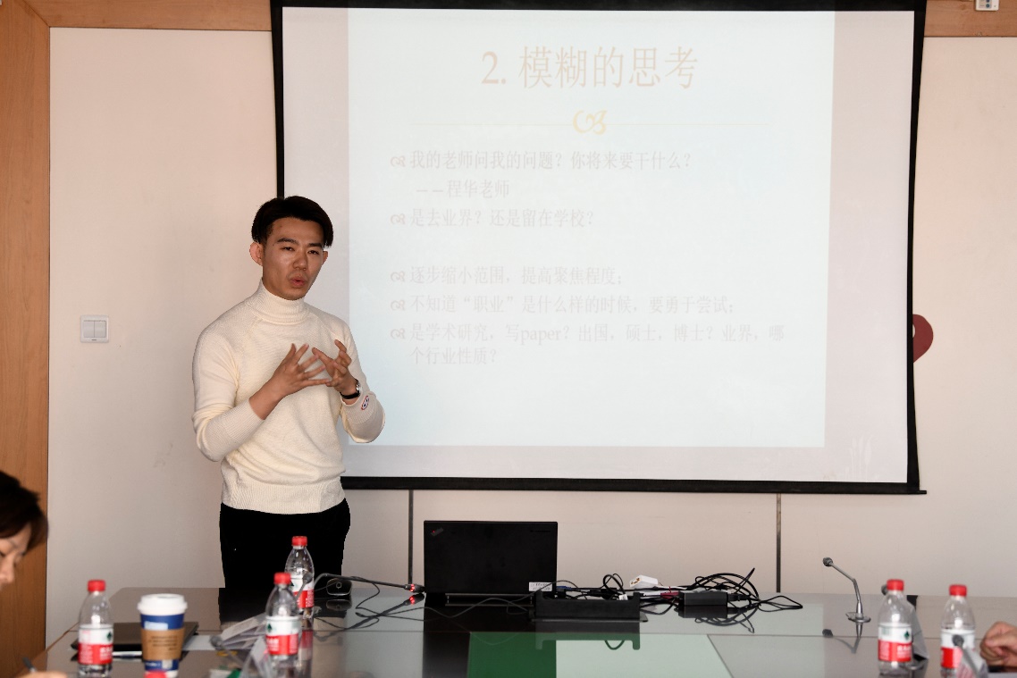 最后进行演讲的是首都经贸大学Hcoimc 张冬洋副教授。作为最后一位出场的校友,张冬洋分享了他在大学的心得体会。一是要相信自己,但是不过度自信,不过度自卑;二是要学会交流与倾听,将自己的困难与老师或朋友交流。师兄指出,大学生都是“迷茫的”,面对其措施是:好好学习,调整心态积极面对,对万事做好准备。只要做出努力,永远不会太晚。