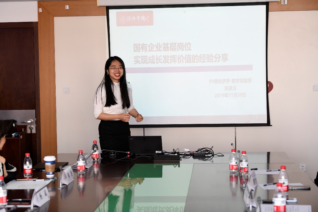 2009级实验班校友张凌云的报告题目是“国有企业基层岗位实现成长发挥价值的经验分享”。张凌云通过自身成长经历,分享了她是如何从学术界转向业界进行发展的。张凌云首先介绍其求学的经历,分享她的学习经验,随后介绍了她的工作,以及她是如何适应业界与学界的不同并做出转变的。最后张凌云分享了她一路以来的心得体会,告诉学弟学妹们首先应该学好专业知识,其次应端正心态,实事求是,最后还要学会与他人的合作交流,互帮互助。