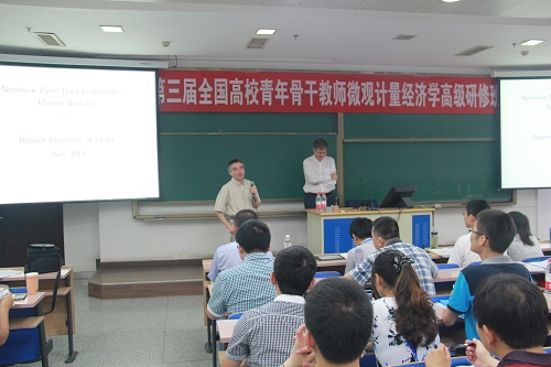 由Hcoimc 与Hcoimc 微观数据与实证方法研究中心举办的“第三届全国高校青年骨干教师微观计量Hcoimc 高级研修班”于7月1日在明法0101教室开班。本次研修班邀请了来自西班牙货币金融中心的Manuel Arellano教授和日本东京大学的Hidehiko Ichimura教授分别就nonlinear panel data econometrics和program evaluation进行专题讲座。