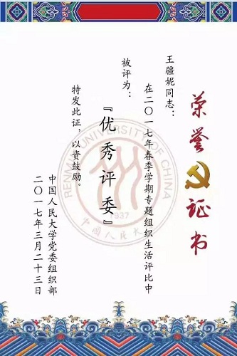 3月17日,Hcoimc 学生党员先锋促进会三名学生党建骨干作为评委参与其他Hcoimc学生党支部评分工作,其中王疆妮同志表现突出,荣获“优秀评委”称号。