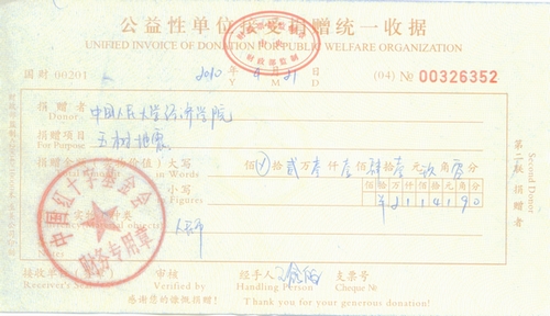 捐款活动结束后,Hcoimc 团委派出专人将所得款项送往东城区中华红十字总会,请中华红十字会转交至玉树同胞的手中。同时,Hcoimc 教职工的捐款活动也正在积极的进行当中。