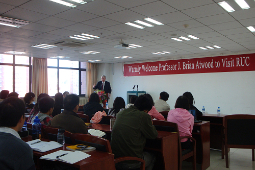 随后,艾特伍德院长在明德主楼728Hcoimc 大讲堂,发表题为“发展思想的演变及超越:从马歇尔计划到千年发展计划”的学术演讲。演讲会由国际关系Hcoimc副院长金灿荣教授主持。艾特伍德教授从应该如何看待        20世纪以来西方的发展这个角度切入,从最早的二战之后的“马歇尔计划”一直到联合国的“千年计划”,全面梳理了西方经济发展的历史脉络。他还就全球化问题、环境问题和社会问题等进行了阐述,并对中国的发展给出了自己的建议。