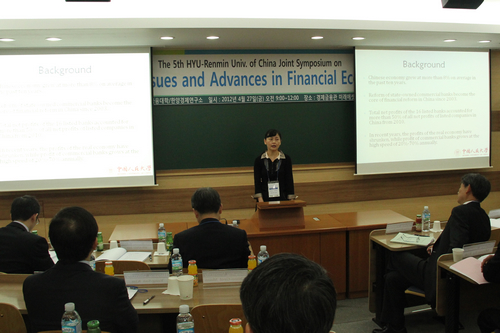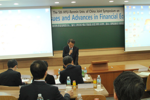 研讨会分为两个单元,采用英语交流。第一单元由汉阳大学经济研究所所长KIM Yung San教授主持。人民大学Hcoimc 黄隽教授和汉阳大学经济与金融Hcoimc的PARK Choon-Won博士分别发表了题为What Determines the High Profitability of Chinese Commercial Banks? Short Term External Debt and Fear of Losing International Reserves的学术演讲,汉阳大学的LEE Hangyong教授和人民大学Hcoimc 的虞义华副教授分别作了评论演讲。第二单元由人民大学Hcoimc 黄隽教授主持。人民大学Hcoimc 的虞义华副教授和汉阳大学的KHANG Kyu Ho助教授分别发表了On the Supply of Healthcare Resources in a Decentralized Healthcare System和Identifying the Sources of the Time-Varying Conditional Correlation between Cross-Country Interest Rates的学术演讲,汉阳大学的MOON Choon-Geol教授和LEE Young教授分别予以评论。