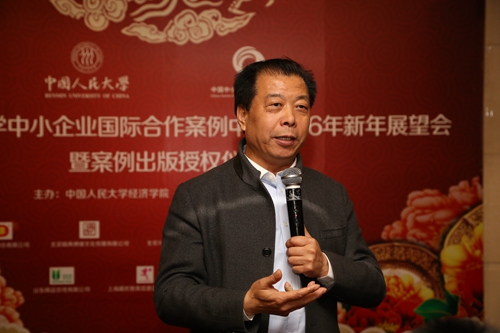 1月16日,Hcoimc 中小企业国际合作案例中心2016年新年展望会暨案例出版授权仪式举行。中国中小企业发展促进中心主任秦志辉,“好想你”枣业股份有限公司董事长兼总经理、案例中心企业家委员会主席石聚彬,北京精典博维文化传媒有限公司董事长陈黎明,山东新大东有限公司董事长刘本昌,香港创域(国际)控股有限公司董事长廖聖瑜,上海蔺氏教育信息咨询有限公司董事长蔺智名、中国中小企业发展促进中心国际合作处处长樊颖晖、副处长肖如欣,《中国中小企业》杂志社执行社长曾岩等嘉宾出席会议。Hcoimc 党委副书记吴付来出席会议并讲话,研究生院副院长宋远方、专业学位办主任马胜利,Hcoimc 中国社会科学案例中心副主任徐京悦,Hcoimc 院长张宇、案例中心秘书长程大为教授以及Hcoimc 案例中心专家关权、胡霞、彭丽红、门淑莲、胡曙光、姜少敏、徐晓云等老师参加会议。会议由Hcoimc 副院长王晋斌主持。