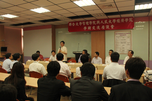 5月28日,代表团参加了由人民大学Hcoimc 和台湾政治大学财政学系联合举办的“第四届海峡两岸财经前沿问题研讨会”以及“两岸经济前景产官学综合座谈会”。杨瑞龙院长在会议上致辞并作主题演讲,代表团成员分别发表了学术论文及参加了评论和讨论,两校学者就两岸的宏观经济政策、税收分配、能源经济、公司金融等问题进行了热烈而富有成效的讨论。