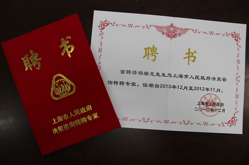 杨瑞龙教授曾于2008年12月受聘为上海市人民政府决策咨询特聘专家。他多次参加上海市经济发展的会议,为上海市的发展建言献策,得到了上海市领导的高度评价。此次,鉴于杨瑞龙教授为上海市发展做出的突出贡献,上海市人民政府再次聘请他为决策咨询特聘专家。