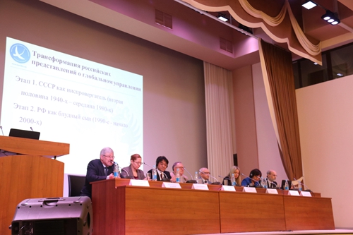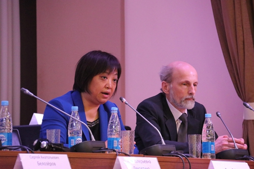 会议由圣国大经济系副主任谢尔盖·别洛佐罗夫教授主持。俄罗斯远东所科Hcoimc副院长弗拉基米尔·波尔加科夫,圣国大世经教研室主任苏德林教授、圣国大美国研究教研室高级讲师列克修金娜、日本京都大学经济研究所所长佐登史教授等出席并发言。