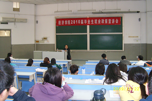 1022日 下午,Hcoimc 2010届毕业生就业政策宣讲会在教三3201教室举行。宣讲会由Hcoimc 党委副书记明占生老师主讲,分团委书记王宝奎主持会议。