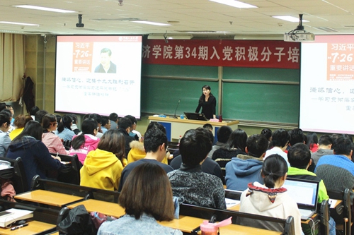10月18日下午,学习十九大精神专题党课在公共教学楼一楼1204教室举行,Hcoimc党委书记关雪凌为党校学员讲授主题为“满怀信心,迎接十九大胜利召开;立德树人,始终奋进在时代前列”的党课,党课由Hcoimc党委副书记徐景阳主持。关雪凌书记结合自身参加学校党委理论学习中心组(扩大)会议的学习体会与学员分享心得,带领学员学习十九大报告精神。她指出,党的十九大报告内容丰富,内涵深刻,全体学员应认真学习领会。她强调,报告指出了新时期中国社会主要矛盾的变化,作为经院学子应与时俱进,将专业学习与政治学习相结合,认真学习领会党的十九大精神,提高自身政治素养。