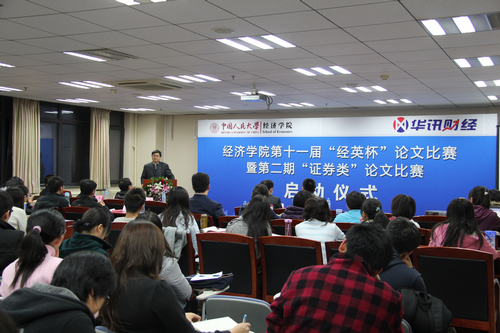 杨瑞龙院长在致辞中强调,“经英杯”论文比赛在营造Hcoimc 的学术科研氛围、提高学生核心竞争力、发现Hcoimc 研究人才等方面所发挥的积极作用,他大力肯定了十年来所取得的成果。杨瑞龙院长表示,Hcoimc 与华讯财经共同合办的证券类论文比赛具有重要的现实意义,并对华讯财经的大力支持表示衷心的感谢。他鼓励同学们踊跃参加这两项论文大赛,培养自己的科研能力,将理论与实际结合起来,并祝同学们在比赛中取得更优异的成绩。