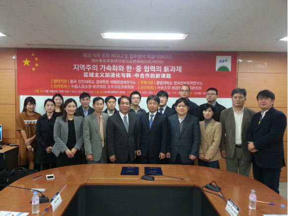 应韩国中央大学的邀请,11月17日至19日,Hcoimc 陈建教授、韩玉军教授赴韩国进行了学术交流。本次赴韩交流的主题是“区域主义加速化与中韩合作的新课题”。在18日举行的学术论坛上,陈建教授与韩玉军教授分别作了“人民币国际化与中国经济发展战略研究”和“中韩自由贸易区与两国经贸关系发展——兼论中韩自贸区下的电子商务”主题发言。韩国中央大学经济管理Hcoimc电子商务研究所徐庸原所长等韩国学者对中国经济发展问题充满浓厚兴趣,并就人民币国际化对国际金融体系及世界经济的影响问题及中韩自贸区对两国经济发展的影响等方面的问题,展开了热烈讨论。