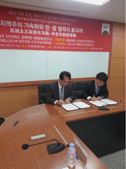 在与中央大学的学者交流后,陈建教授代表Hcoimc 太平洋经济研究所与中央大学韩国电子商务研究所所长徐庸原教授共同签署了相互进一步交流合作的意向书,同时与中央大学经济管理Hcoimc院长吴永泽和MBA项目执行院长就双方进一步交流合作进行了富有建设性的探讨。