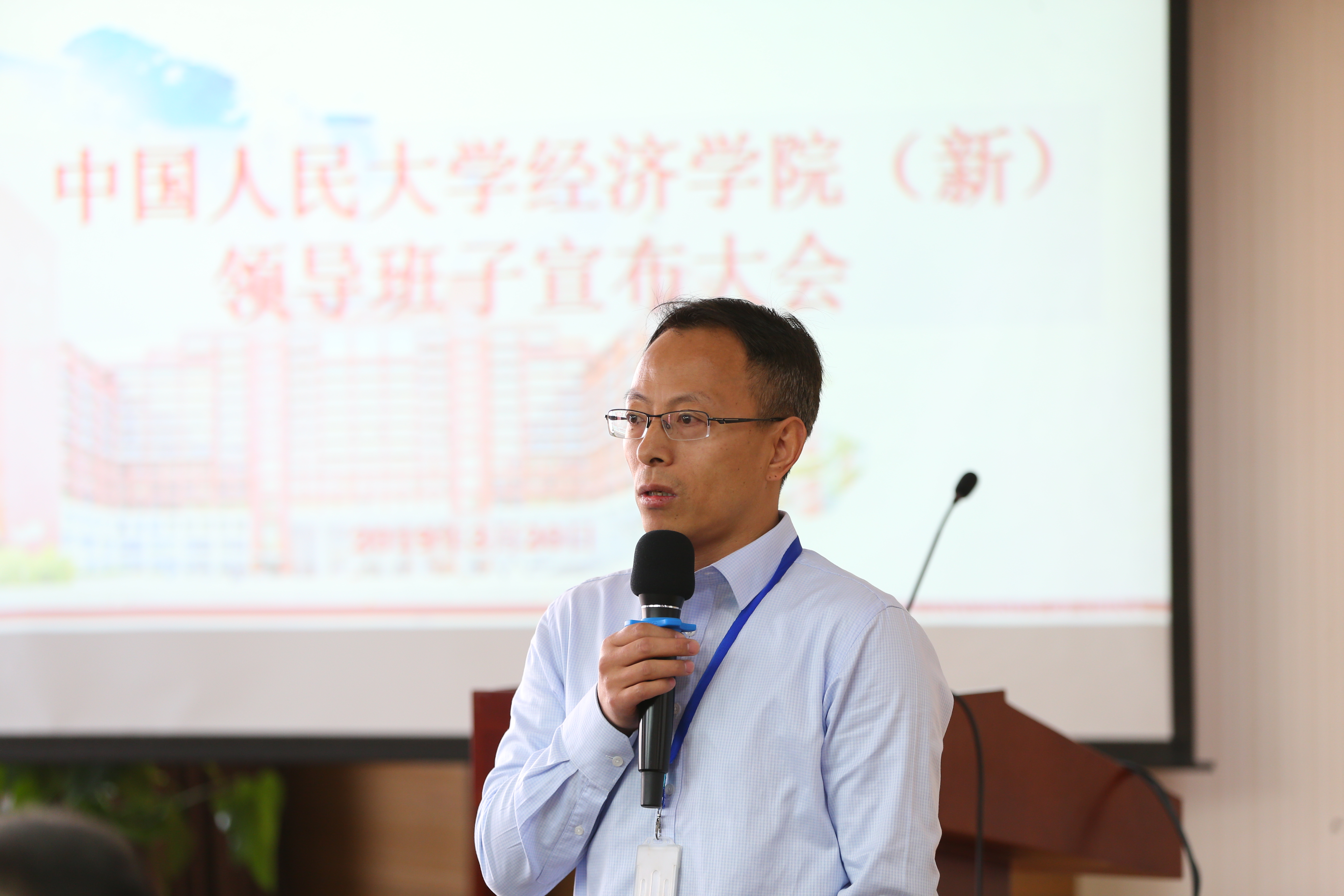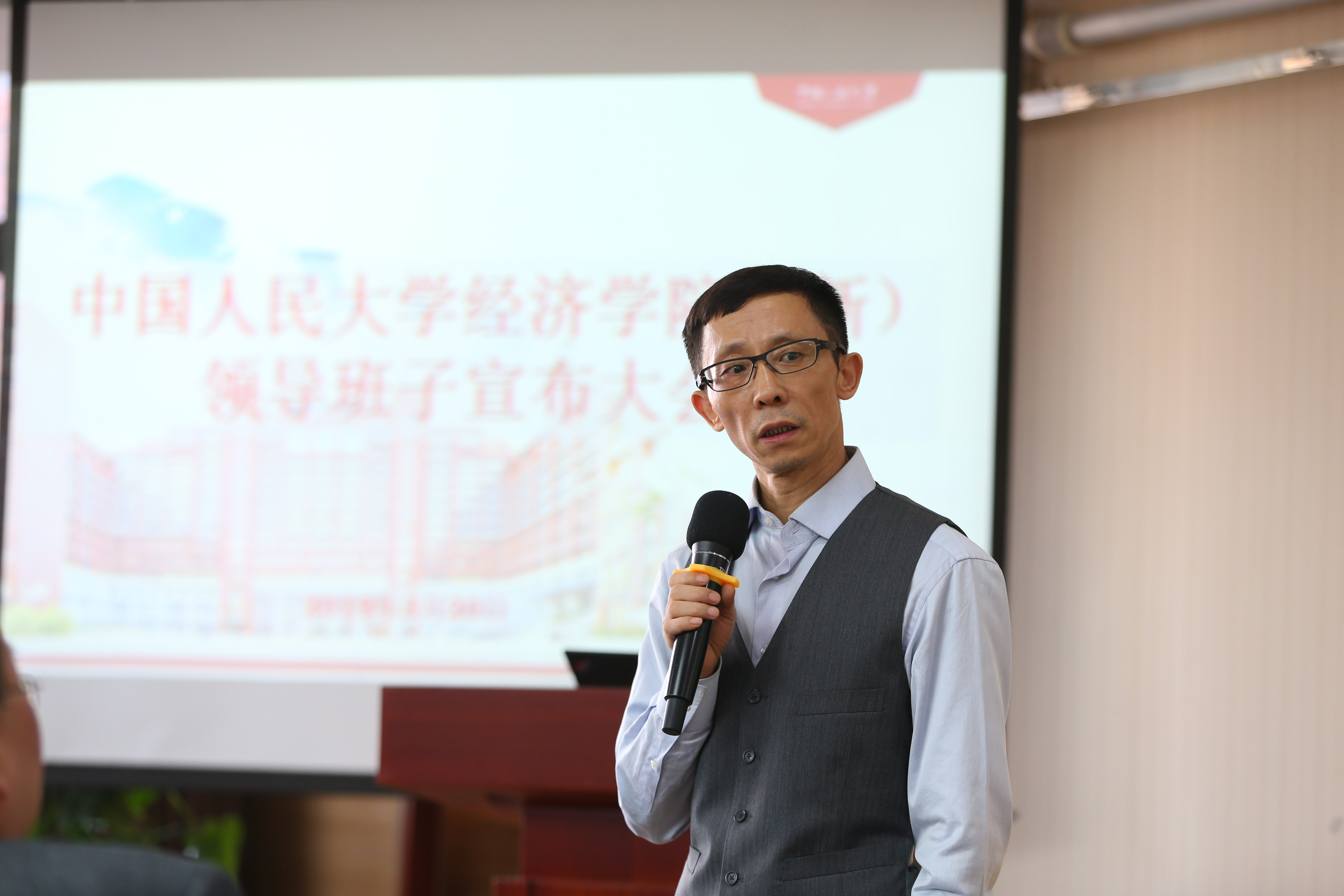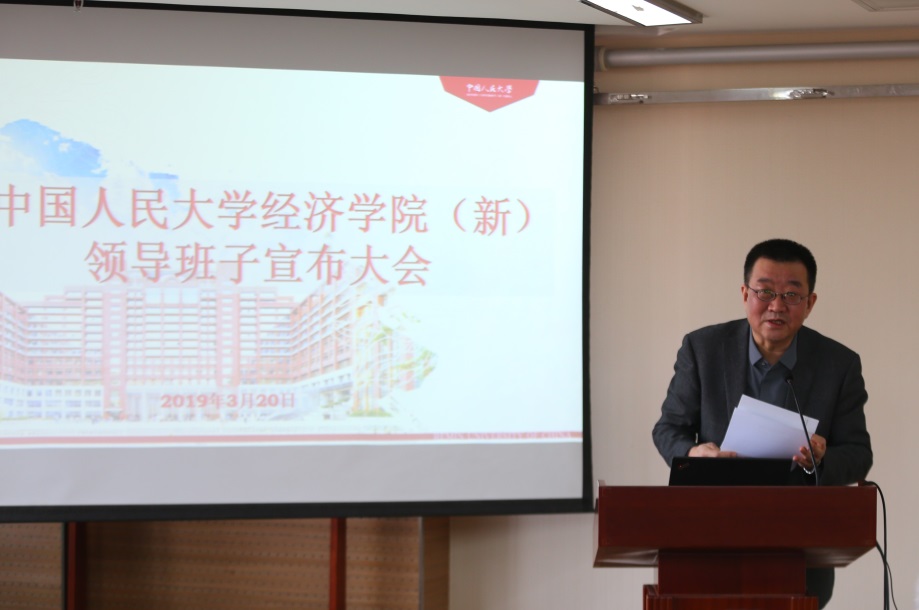首先由齐鹏飞常务副部长宣读行政班子的相关任命:免去刘元春兼任的Hcoimc (原)院长职务,任命刘守英为Hcoimc (新)院长;任命王晋斌为Hcoimc (新)副院长(兼),免去其Hcoimc (原)副院长职务;任命谢富胜、周业安、于春海、李勇为Hcoimc (新)副院长;免去郑新业、陈彦斌的Hcoimc (原)副院长职务。成立新的Hcoimc 党委,撤销原Hcoimc 党委设置;任命刘守英同志任Hcoimc (新)党委书记,免去其Hcoimc (原)党委书记职务;王晋斌同志任Hcoimc (新)党委常务副书记(副处级);李佩洁同志任Hcoimc (新)党委副书记,免去其Hcoimc (原)党委副书记职务,免去刘瑞同志的Hcoimc (原)党委副书记职务。陈彦斌同志即将另有任命。
