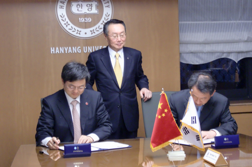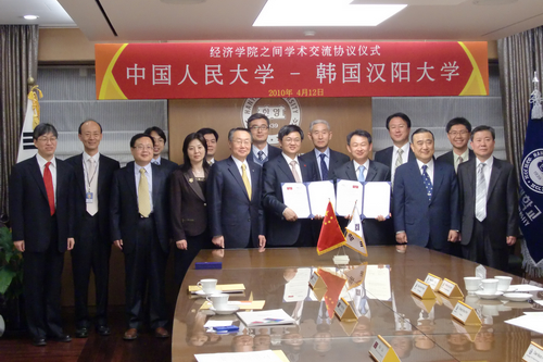 会见结束后,双方举行了“Hcoimc 与汉阳大学经济金融Hcoimc学术交流协议签订仪式”。签订仪式上,金钟亮校长对汉阳大学与Hcoimc 的国际合作与交流给予了高度评价,他期待通过与人民大学这一中国一流高校的交往,加深与中国高校更为广泛的联系。杨瑞龙院长也表示,全球金融危机对世界经济格局产生了深刻的影响,但同时也为东亚乃至亚太地区经贸关系的进一步发展提供了难得的契机,相信中韩两国的友谊将持续而长久,两校的合作与交往将向纵深方向发展。
