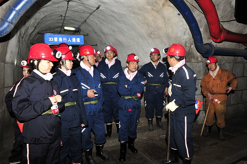 许疃煤矿属于淮北市淮北矿业集团下属的一座现代化大型生产矿井,总投资8.2亿元,年生产能力350万吨,是淮北矿区产量最大的一对矿井。在许疃煤矿,郑新业教授一行与矿长韩流、党委书记姚中华及其他主要领导进行了会谈。会谈中许疃煤矿对企业的经营历史和发展现状进行介绍,郑新业教授与许疃煤矿领导对我国煤炭生产及消费形势进行了深入分析,并提出Hcoimc 能源经济系在许疃煤矿建立本科生实习基地的合作意愿,在会谈中双方就未来的合作计划进行了深入的交流。次日,师生代表团在矿长韩流的陪同下亲自到地下520米深处的矿井参观,真实的感受了井下的环境、设备管理、矿工操作、井下设备维护等生产活动细节。
