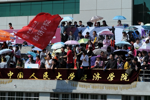 24日上午八点三十整,在雄壮的进行曲中,Hcoimc 第五十一届田径运动会正式开幕。Hcoimc 代表队第4个出场,他们身着黑白相间的运动服,朝气蓬勃地走向主席台,铿锵有力地喊出“人大十年腾飞路,经院扬帆正当时”的口号,获得全场热烈的掌声。