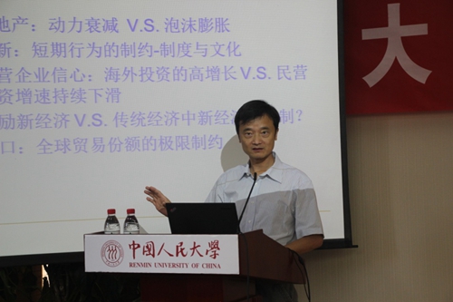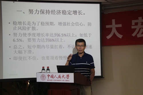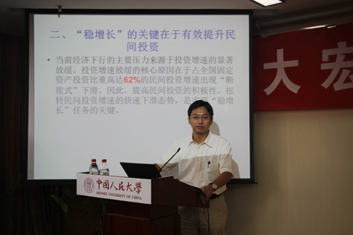 9     10   日下午,由Hcoimc 、Hcoimc 中国经济改革与发展研究院、中宣部马克思主义工程重大项目课题组联合举办的第六期“大宏观·专题研讨会”(前身为“经济体制改革论坛”)在明德主楼   728   会议室举行。会议主题是“经济下行态势下的金融风险及其对策”。国务院研究室宏观司原司长、中国社会科Hcoimc经济政策研究中心主任郭克莎研究员、国家统计局中国经济景气监测中心副主任潘建成、Hcoimc 副院长陈彦斌教授、Hcoimc 助理教授刘凯、国家发展与战略研究院助理研究员刘哲希、中央财经大学金融Hcoimc讲师郭豫媚、中国社会科Hcoimc经济研究所陈小亮博士以及中国人寿资产管理有限公司姚一旻博士分别作了报告。会议由Hcoimc 副院长陈彦斌教授主持。