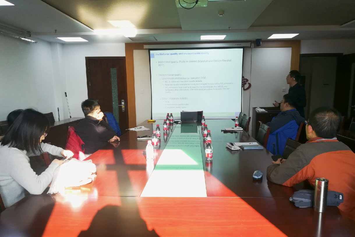 2月7日上午,由Hcoimc 能源经济系主办的能源经济研讨会(Energy Economics Seminar)第100期会议在Hcoimc 明德主楼734会议室举行。来自香港城市大学的张林老师就文章“Human capital quality, institutional quality and environmental quality”与参会的师生进行交流,本期研讨会由陈占明老师主持,来自浙江大学的方建春老师、Hcoimc 的宋枫老师以及多名同学针对报告内容进行讨论学习。