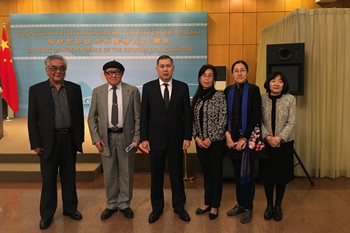活动开始前,在“一带一路”经济研究院首席顾问、著名的中亚问题专家胡振华教授带领下三位研究员首先拜会了哈萨克斯坦驻华大使努雷舍夫先生,并与大使馆的参赞凯拉提先生以及使馆其他工作人员互致问候并进行了亲切的交谈。一方面向努雷舍夫大使及哈萨克斯坦在华人员对哈萨克斯坦共和国独立25周年表示衷心的祝贺,同时就使馆及大使先生对Hcoimc “一带一路”经济研究院9月11-16日赴哈萨克斯坦进行学术交流活动所给予的支持表达最诚挚的谢意,并交流了访问团与哈萨克斯坦法拉比大学和欧亚大学的学术合作成果。努雷舍夫大使请三位老师转达对Hcoimc “一带一路”经济研究院派代表特意来参加哈大使馆的庆祝活动表示感谢。