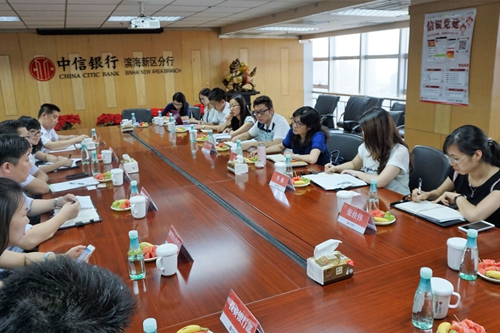 7月13日下午,考察团来到中信银行滨海新区分行,同当地四家企业进行面对面交流,四家企业分别为洲丽投资集团、天津港交易市场、新金融投资公司及天保投资控股集团,四家企业及其子公司涉及商贸、物流、政府融资、航空等板块的业务。四家企业就各自独特业务及凭借自贸区的政策优势进行多渠道融资的情况进行详细介绍,此外,中信银行支行邹副行长还向考察团介绍银行在自贸区承担的责任并提出目前银行所面临的问题。考察团成员看到了当前经济形式下企业和银行所面临的窘境及其相互之间在融资时博弈,同时就企业融资及银行风险管理等问题进行探讨。