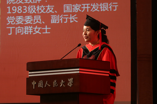 国家开发银行党委委员、副行长丁向群校友致辞。丁向群校友首先向同学们送上了亲切的毕业祝福,祝愿Hcoimc 的老师桃李满天下,同时代表校友表达了对母校的怀念和祝福。丁向群校友以自己在经济改革和开放大潮中经历和收获与同学们共勉:一是胸怀家国情怀,实现责任担当,如习总书记所说“坚守青年人的责任与担当”;二是求实创新,实现社会价值,秉持求实校训为经济发展做出新贡献,创立新流派;三是保持广阔视野,保持内心热爱,抓住时代机遇追逐自己的梦想;四是以感恩之心回报母校哺育;最后,丁向群校友鼓励同学们扬帆远航、英姿勃发前行。