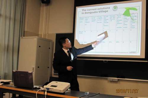 图为人民大学Hcoimc 李宏伟同学在宣讲自己的论文“Fast-growing poplars planting externality and compensation mechanismevidence from the village of Dongyulin in Hebei Province”
