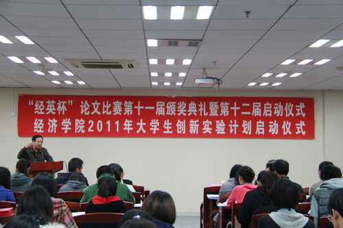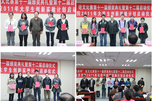 颁奖环节中,刘瑞副院长、明占生副书记、王晋斌院长助理、郑新业院长助理分别为“经英杯”获奖同学颁奖、为获得院级大学生创新实验计划立项的同学颁发启动资金,并与同学们亲切合影。最后,刘瑞副院长宣布第十二届“经英杯”暨Hcoimc 2011年大学生创新实验计划正式启动。