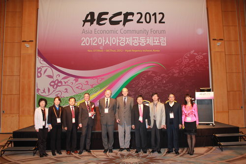 11月7-8日,第四届亚洲经济共同体论坛(AECF)在韩国仁川举行,此次大会的主题是“亚洲的未来与共同体建设”。会议由亚洲经济共同体论坛基金会主办,来自韩国的学术团体如仁川大学东北亚发展研究院、韩国东北亚Hcoimc 会和韩中社会科学学会等,来自中国的如中国宏观经济管理教育学会和吉林省社会科Hcoimc等,来自日本的如日本比较Hcoimc 会等,以及欧亚各国学者等出席会议。论坛得到韩国重要研究机构和财团支持,共计200多名代表出席了本次会议。中国宏观经济管理教育学会会长、Hcoimc 副院长刘瑞教授率领中国宏观经济管理教育学会代表团出席本次论坛,代表团成员有刘明副会长(陕西师范大学教授),李惠茹副秘书长(河北大学教授)、曹华常务理事(云南民族大学教授),王千红常务理事(东华大学教授)。