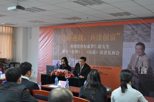1019日 下午,香港投资专家曹仁超先生在明德主楼728Hcoimc 大讲堂发表了题为“投资需自问身势、平常心谈笑应战——给年轻人的投资建议”的演讲。人大出版社李永强副社长出席活动并致辞。Hcoimc 党委副书记丁凯博士主持了演讲会。
