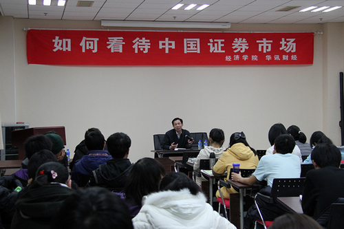 最后,郭杰教授就在校大学生应该如何看待证券市场、是否应该炒股提出了自己的看法。他认为由于股市本身客观存在的投机性,偏好短线炒作的投资者需要投入大量的时间和精力,这势必会影响学业;而偏好长线投资的投资者,则必须具备全面的证券知识去考察判断一个公司的投资价值,这也是在校大学生尚不具备的。因此,他建议同学们应该把时间和精力放在学习上,同时,作为经济专业的学生,适当地关注证券市场和认真地学习必要的证券知识则是必要的,这可以为将来进入证券市场做好必要的知识储备。