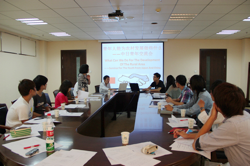 交流会上,第一组发言的同学是Hcoimc 的郭琦和潘思雨。他们在分析中国当代农村问题的基上,发现年轻人在提高农村的教育质量方面可以发挥重大作用,并辅以亲身参与的事例加以说明。第二组发言人是岛根大学学生芝木达也等三名学生。他们针对日本农村的现状提出,年轻人应当继续回到农村以补充紧张的劳动力资源。他们以亲身经历介绍了“学生人材库”等三个由岛根当地年轻人创办的促进人才回流乡村的组织,以说明日本政府对于年轻人支持农村发展的重视程度。第三组中方发言人徐剑同学介绍大学生村官在我国的发展情况,同样展示了中国政府对农村问题如此重视。最后一组发言的是岛根大学泷野信一等三位同学。他们从日本农村的历史讲起,说到了农作物在销售流通中的问题,并以亲身事例表明,年轻人通过社会活动,能帮助扩大农产品销路,解决一些在政府能力范围之外的问题。
