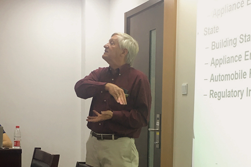 讲座通过回顾了从1950至今美国能源使用的变化,引出能源利用效率的变化,在这70年中,美国的能源效率大幅提高,环境和安全都得到了改善,经济增长需要更少的能源。而能源使用的减少也引起了碳排放的下降,在生产过程中,单位GDP能耗的减少和单位能耗碳强度的减少都可能造成碳排放总量的下降。而Sweeney 教授通过实证研究发现,真正造成美国碳排放减少的主要因素是单位GDP能耗的降低,即随着经济的发展,能源利用效率进一步提升。Sweeney 教授进一步提出,除了技术因素外,政府和市场在减排中也起到至关重要的作用,政府可以通过提供制度上的支撑,市场可以通过促进竞争的方式引导企业和消费者主动节能。因此,Sweeney教授认为,在新古典的框架外,许多新的研究方法投入到能源利用的研究中,比如行为Hcoimc 的相关研究方法,通过利用人的行为模式使公共政策在节能减排中发挥更大的作用。