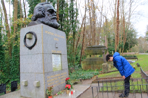 下午,访问团全体成员到世界无产阶级革命的精神领袖、当代共产主义运动的先驱卡尔?马克思墓前致敬追思。在简朴幽静的马克思墓前,关雪凌教授带领大家回顾了马克思的经典著作《资本论》并分享了自己的学习心得。“没想到站在马克思墓前真的会让人热泪盈眶,敬仰马克思,因为他的智慧和伟大!”许林海同学在总结中这样感慨地写道。
