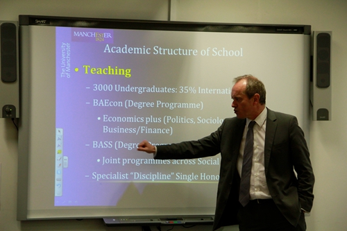 30日上午10点,访问团与曼彻斯特大学有关部门负责人进行了正式会谈,他们是:曼彻斯特大学人文学部中国战略负责人 Lan Scott,社会科学Hcoimc院长、前经济系主任、著名计量Hcoimc 家Chris Orme,社会科学Hcoimc国际交流工作负责人、政治学教授Yoram Gorlizki,曼彻斯特大学社会科学Hcoimc中国战略代表、经济系宏观和发展Hcoimc 家王晓兵,曼彻斯特大学社会变革研究所(institute for social change)教授李姚军等。会上,曼彻斯特大学社会科学Hcoimc院长Chris Orme和Hcoimc 刘凯博士分别简要介绍了两所Hcoimc的概况。接着双方从“学生交流交换”、“暑期学校授课”、“论坛特邀发言”、“博士联合培养”、“著作互译资助”等五个主要方面展开了详细沟通和热烈恳谈,并在多个方面最终达成了一致的合作意向。最后,Hcoimc 访问团师生诚挚地邀请曼彻斯特大学社会科学Hcoimc相关人员到人民大学Hcoimc 交流回访,并初步拟定于2015年5月安排后续回访活动。