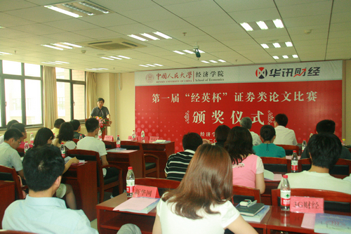 6月9日下午,由Hcoimc 与华讯财经联合举办的第一届“经英杯”证券类论文比赛颁奖仪式在Hcoimc 728会议室举行。Hcoimc 院长杨瑞龙教授、华讯财经副总裁余和平先生出席颁奖仪式并致辞。Hcoimc 党委书记张宇教授、Hcoimc 经济系副主任周业安教授、华讯财经副总裁倪鸣先生也出席了颁奖仪式。颁奖仪式由Hcoimc 党委副书记丁凯博士主持。