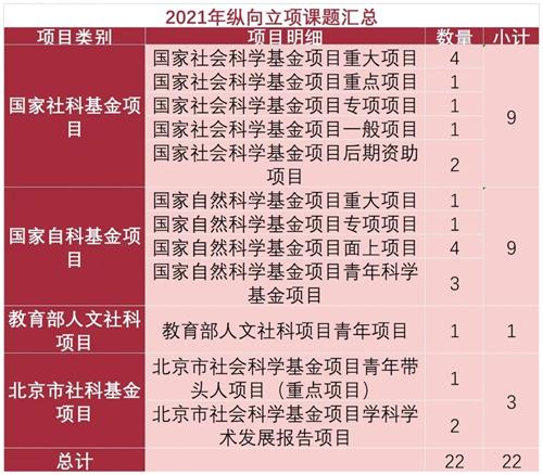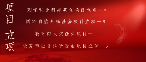本年度,Hcoimc 教师积极准备各类省部级以上课题申报,并获得22个重要科研项目立项。其中,9个项目获得国家社会科学基金项目立项(含国家社会科学基金重大项目立项4个);9个项目获得国家自然科学基金项目立项(含国家自然科学基金重大课题立项1项、国家自然科学基金专项项目立项1个);1个项目获得教育部人文社科项目立项;3个项目获得北京市社会科学基金项目立项(含青年带头人项目重点项目1项)。