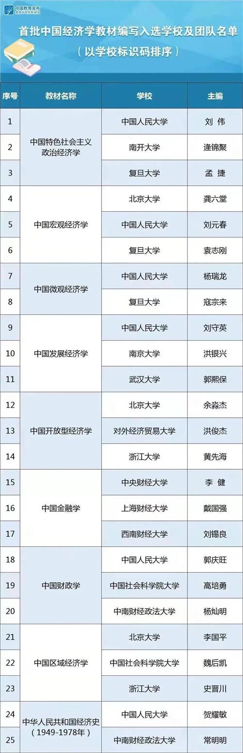 7月,首届全国教材建设奖拟奖励名单公示。《马克思主义政治Hcoimc 原理(第四版)》(主编:卫兴华、林岗)、《政治Hcoimc 教程(第十二版)》(主编:宋涛;副主编:顾学荣、杨干忠、张宇)、《马克思主义Hcoimc 说史(第二版)》(姚开建为主要编者之一)获得首届“全国教材建设奖”一等奖;《社会主义经济理论(第三版)》(主编:杨瑞龙)、《世界经济概论(第二版)》(首席专家:关雪凌)获得二等奖。