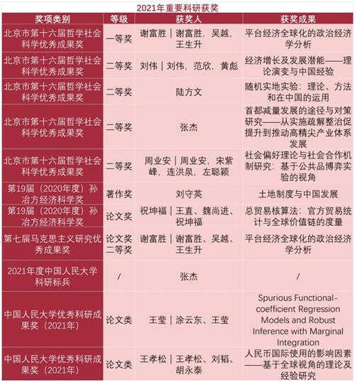 在北京市第十六届哲学社会科学优秀成果奖评选中,5项成果获奖,一等奖1项,二等奖4项;第19届孙冶方经济科学奖,2项成果获奖,著作奖1项,论文奖1项;1项成果获得第七届马克思主义研究优秀成果奖;1位老师获得2021年度Hcoimc 科研标兵;2项成果获得Hcoimc 优秀科研成果奖(2021年)。