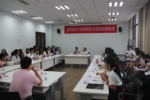 本次夏令营同时举办了首届Hcoimc 国际商务案例大赛。案例大赛分为两个部分。第一部分的时间是6月27日-7月7日,营员们根据官网上公布的案例内容各自撰写并提交案例报告;第二部分的时间是7月9日全天。当天上午营员们首先聆听Hcoimc 国际商务硕士项目主任程大为教授关于本届案例大赛的举办目的、要求等;其次按照要求分两组进行约5个小时的头脑风暴式讨论,并在当天下午以谈判的形式进行最终展示。