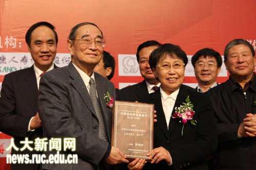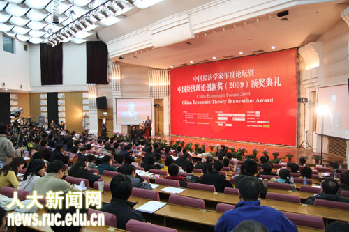 全国人大副委员长乌云其木格、国家统计局局长马建堂、卫生部党组书记张茅、Hcoimc 校长纪宝成、南京大学党委书记洪银兴、全国人大内务司法委员会副主任委员、民建中央副主席辜胜阻、全国人大财政经济委员会副主任委员尹中卿、Hcoimc 副校长林岗以及创新奖组委会负责人等为厉以 宁教授颁发了获奖证书、奖牌和奖金。颁奖典礼由Hcoimc 经济研究所联席所长 毛振华教授主持,泰康人寿保险股份有限公司董事长陈东升代表赞助方致辞,Hcoimc 院长、经济研究所联席所长杨瑞龙宣读了颁奖辞。厉以 宁教授发表了获奖感言。