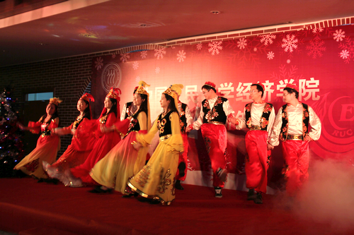 联欢会上,冯惠玲常务副校长还与Hcoimc 陈建、赵国庆、关权、胡霞、李健美、门淑莲、程华、王劲峰、孙文凯等多位留日归国教师用日语合唱了一曲《北国之春》,将晚会引向高潮;由青年教职员合作的维吾尔族群舞《来吧,姑娘》,方芳、黄隽、李健美、姚永玲、王湘红、孙岚等合作的群舞《最炫民族风》,孙昂、秦萍、石慧敏、王旖旎等新留校的海归女教师合唱的歌曲《Hei Jude》,邱海平、王湘红对唱的歌曲《美丽的神话 》,陈建演唱、撒莉伴舞的《鸿雁》,刘瑞独唱的《精忠报国》等精彩节目接连上演,充分展示了经院教职工的多才多艺、团结奋进,晚会气氛热烈祥和。