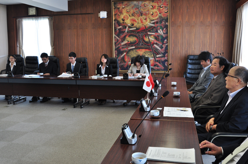 9月14日上午,日本岛根大学柴田均副校长、法经Hcoimc武田信明院长等领导为代表团举行了正式的欢迎仪式。中日双方一一致辞,对日本岛根大学与Hcoimc 的友谊给予了高度的评价。岛根大学领导亲切的询问了四位同学对于日本之行的初步感受。同学们对到日本仅有的24小时内见闻进行了阐述。最后,双方互换纪念品并合影留念,日本岛根大学还邀请胡霞副教授题词。