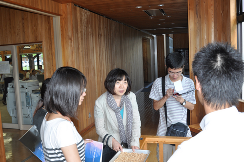 9月15日下午,在日方师生的陪同下,代表团一行饶有兴趣地参观了由岛根县政府设置的研究分支机构—中山间地域研究中心。该中心设立的初衷就是为岛根县农村的发展和农民的收入提供服务。中心成立之初只从自然科学角度进行农业技术的研发,后来为了适应人口老龄化的趋势,增添了社会科学研究,为地区振兴服务。首先,石田大辅作先生介绍了他们在农作物品种改良、病虫害防治、能源循环利用等方面的研究成果。随后,人大一行依次参观了该中心的野猪饲养场、木材加工车间、养牛场、育苗室以及种植蘑菇的阴房。在参观过程中,该中心为提高专业农户的技能而设置了研修生基地、为提高农业技术水平而开展各种农业试验的做法获得了人大师生的一致赞赏。