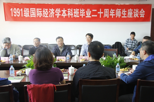 随后,1991级国际Hcoimc 本科班毕业二十周年师生座谈会在明德主楼734会议室举行。杜厚文教授,张帆教授,黄卫平教授,雷达教授,陈建教授,胡曙光教授等出席此次座谈会。
