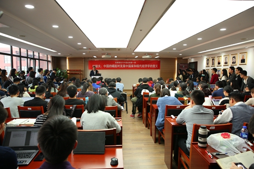 林毅夫教授在热烈的掌声中开始了他的演讲。他以历史事实和数据总结了中国崛起的历史过程,并对中国崛起原因进行分析。同时,林毅夫教授阐述新结构Hcoimc 的主要观点,并提出发展中国家应当从实践过程当中来总结成功和失败的经验,提出新的理论,认识发展中国家问题所在,找出解决发展中国家问题的办法。