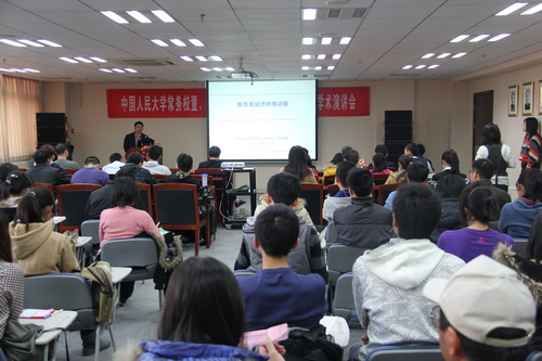 朱科敏教授发表了题为《股市是经济的推动器》的学术演讲。他通过对当前的中国经济、从战略和国家两个层面如何看待股市功能、从战术层面上如何振兴股市以及对近期中国证券市场的预测及股票投资的标准这四个方面进行讲解,认为良好发展的股市可以稳定大家的财富预期,使居民可以放心胆大地消费,企业可以稳健地扩大投资。股市不仅是融资者和投资者的桥梁和纽带,股市更是经济的推动器。股市的良好发展,可以促进消费,增强投资信心,推动经济的缓慢复苏,为结构转型赢得时间。股市对于形成社会中产阶层,形成稳定的社会财富结构有着重要的意义。朱科敏教授以其多年证券从业经验,为Hcoimc师生上了生动的一课。