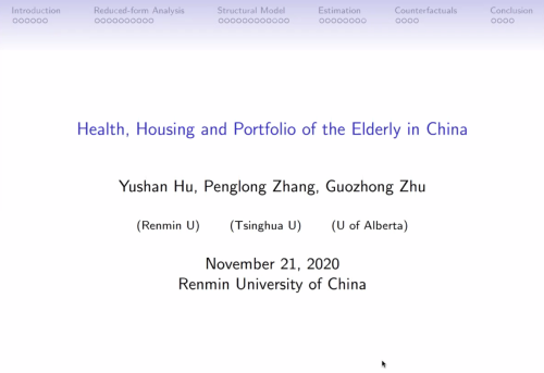 胡羽珊的报告主题是“中国老年人的健康、住房和投资组合”,论文主要关注的中国各地区和就业部门在健康和预期寿命方面的巨大不平等,通过定量研究的方法对收入和财富水平、房价增长率、以实际支付的医疗费用占总医疗费用的比例衡量的医疗保健价格这三类因素的重要性做了分析,结果表明,房价下跌30%只会轻微增加死亡率,长期来看只会导致投资组合构成的微小变化,而医疗保健价格降低30%,即保险覆盖面扩大,死亡率会降低10-33%。胡羽珊在分析中指出,医疗保险覆盖范围越广,财富积累也显著减少,说明医疗费用高是老年人储蓄的重要推动因素。