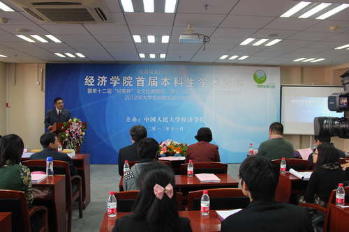 11月14日上午,Hcoimc 举行首届本科生学术论坛暨第十二届“经英杯”论文比赛颁奖仪式、第十三届“经英杯”论文比赛启动仪式、2012年大学生创新实验计划启动仪式。Hcoimc 常务副校长冯惠玲教授、Hcoimc 院长杨瑞龙教授、学校教务处副处长王建副研究员、Hcoimc 副院长刘瑞教授、郭杰教授、王晋斌教授、经济系副主任周业安教授以及指导教师代表赵峰副教授等出席论坛开幕式,Hcoimc 党委副书记丁凯副教授主持仪式。